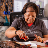 At the Curtis Bay production site, the “worker bees” as they affectionately call themselves, handcraft all products using local honey and beeswax and gain experience in product development, manufacturing, inventory management, and customer service. Their hands and stories are in every candle, scrub, and bar of soap. The opening of the Hon’s Honey Marketplace and coffee shop on S. Hanover Street in Baltimore’s Brooklyn neighborhood in 2023, added training opportunities in barista skills and retail management.
