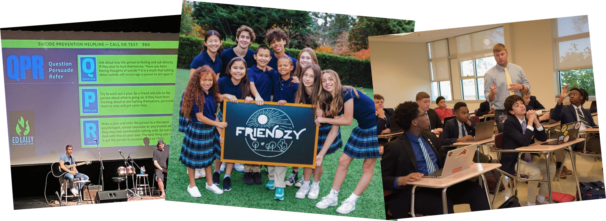 From left to right: The Ed Lally Foundation’s “mental health rock band” plays a school assembly, students participate in Friendzy’s Character Development Program, and a young teacher in the classroom at Calvert Hall. All photos used with permission.